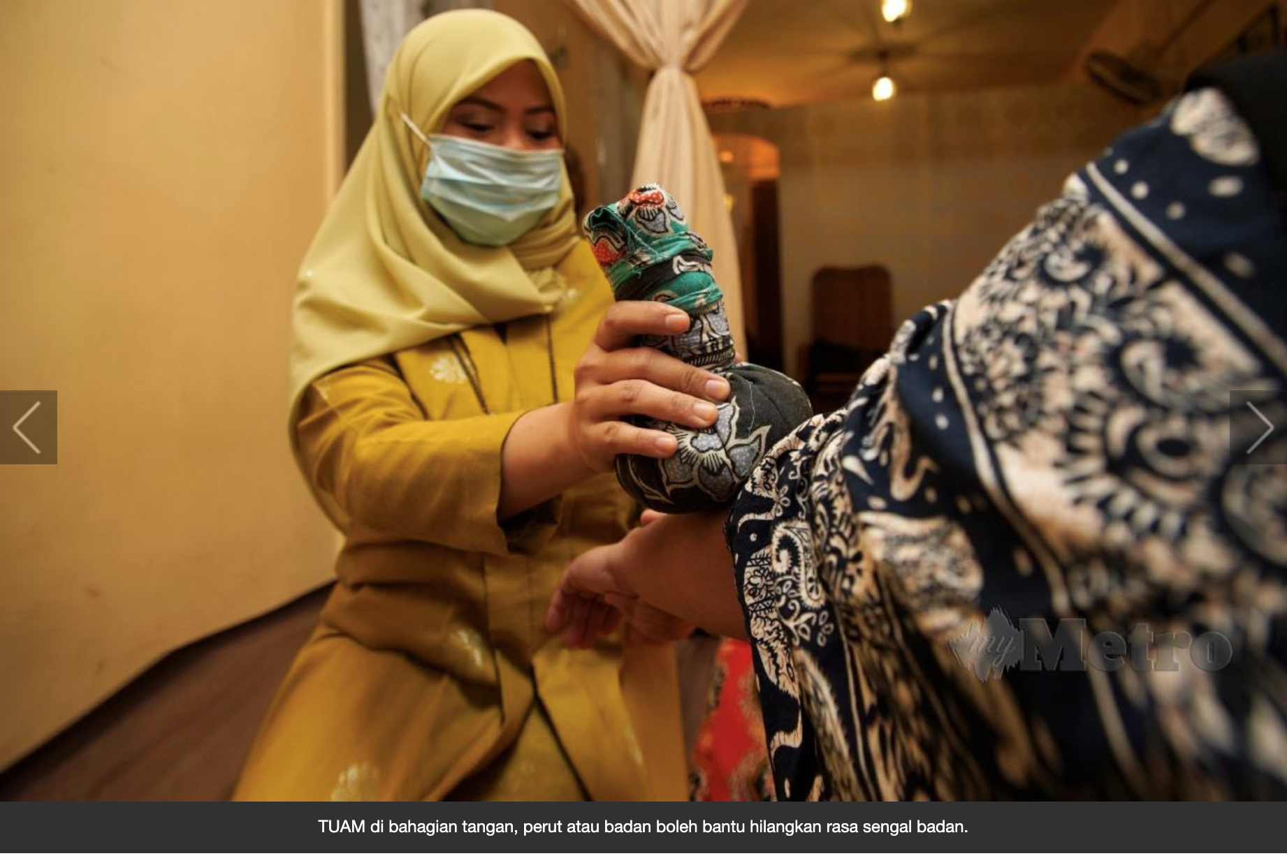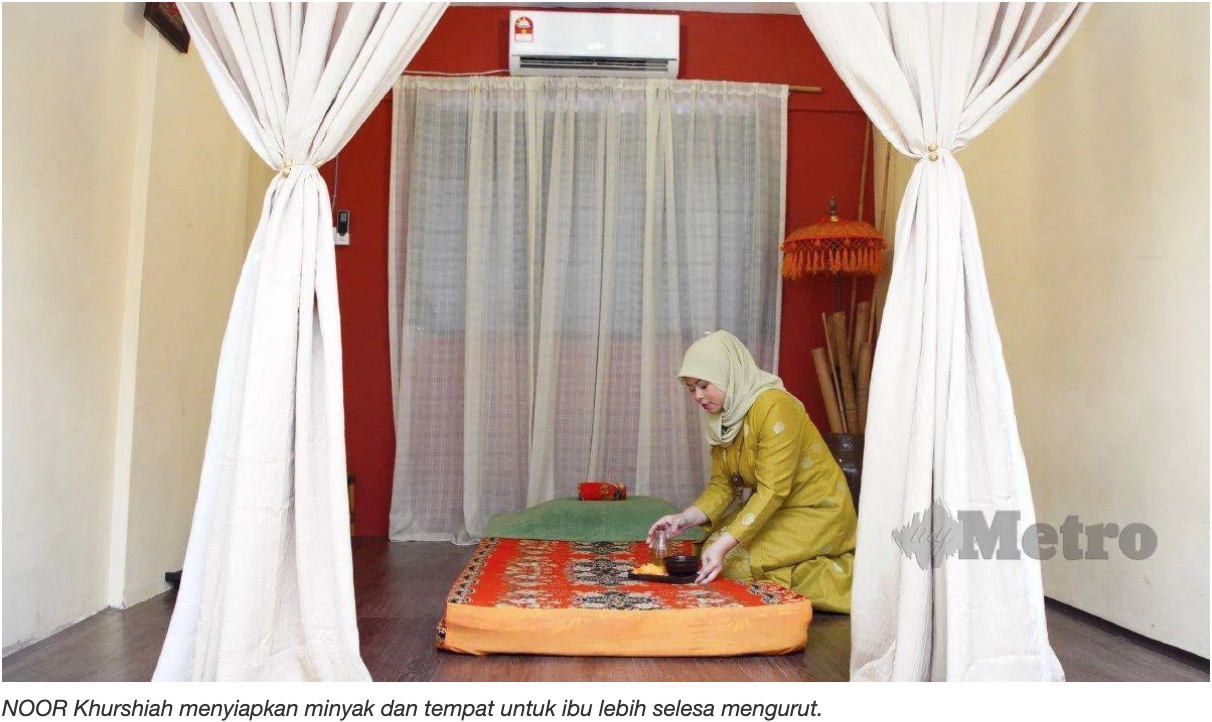 “Sebenarnya untuk rawatan wanita selepas bersalin, peringkat awal cukup hanya berurut. Urutan juga hanya membabitkan bahagian tubuh tertentu seperti payudara, muka, tangan dan belakang badan.